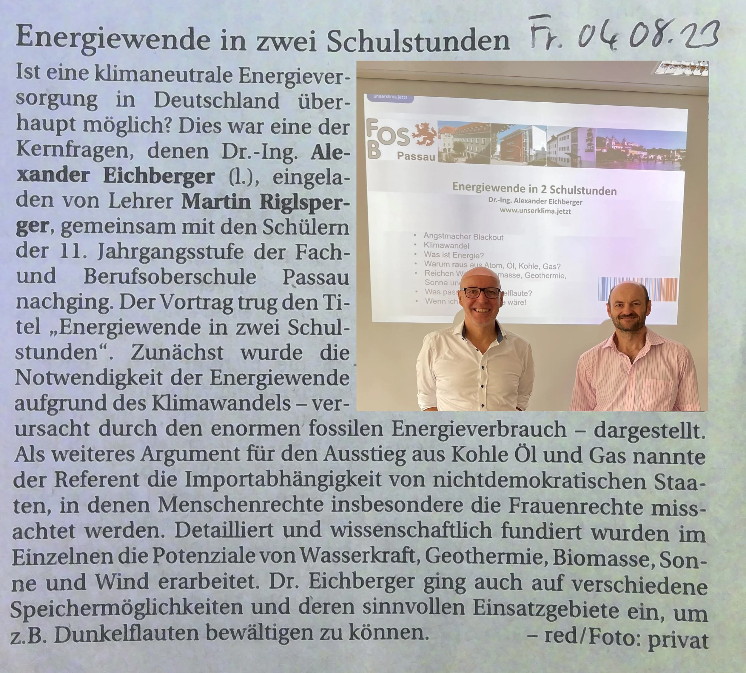 Schulvortrag: Energiewende in 2 Schulstunden Presse 7. Aug. Verfasst von Alexander Eichberger Passauer Neue Presse vom 4.08.2023 KlimaVortrag Alexander Eichberger https://www.unserklima.jetzt